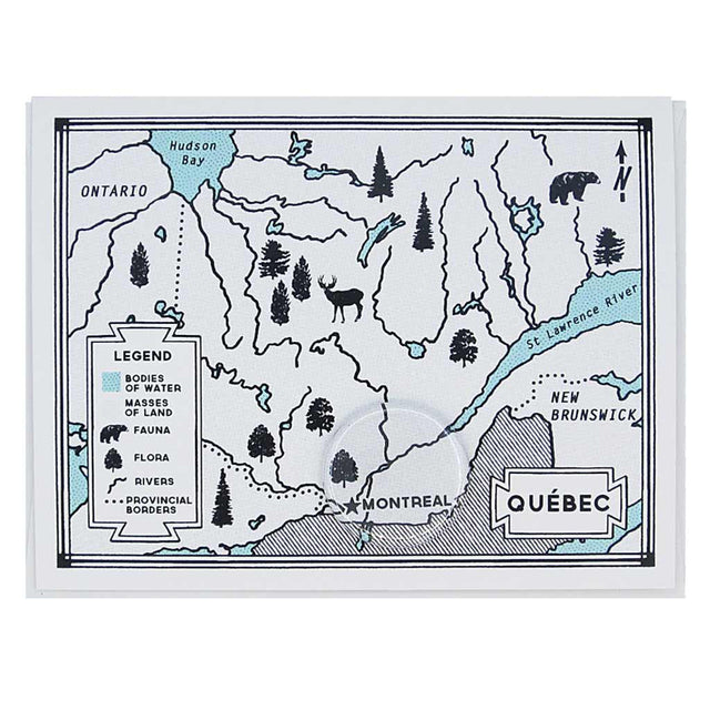 For locals and tourists alike. This map of Québec features a 1¼” button of Montreal that can be taken off and worn by the recipient. Card measures 4¼” x 5½”, comes with a white envelope & is blank inside.