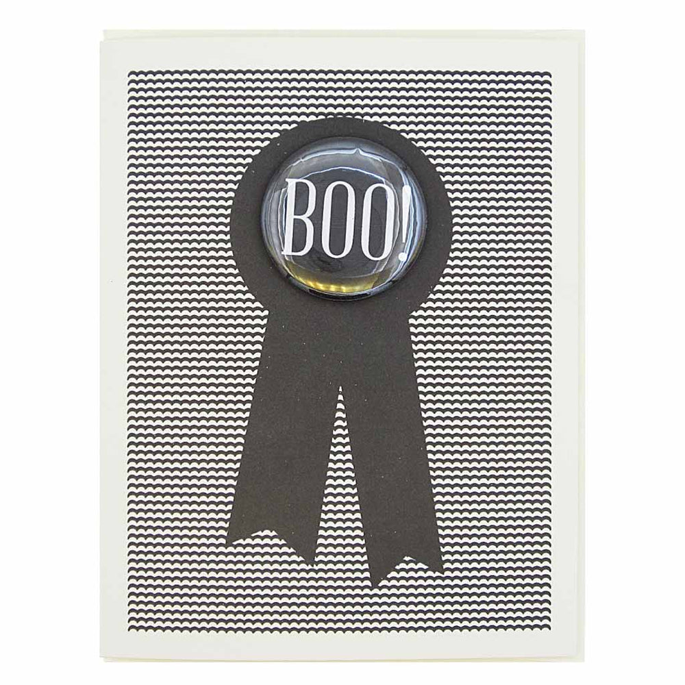 Boo! Features a 1½” button that can be taken off and worn by the recipient. Card measures 4¼” x 5½”, comes with a cream envelope & is blank inside.