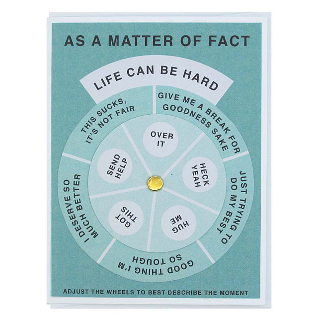 Adjust the wheels to best describe the difficult moment. Card measures 4¼” x 5½”, comes with a white envelope & is blank inside.