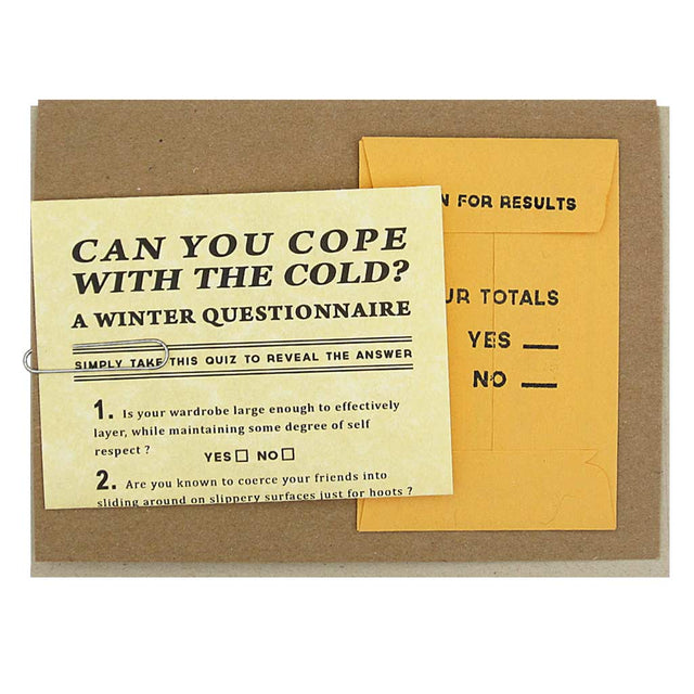 Send this funny winter questionnaire to someone near or far. Once complete, the recipient can open the tiny envelope on the front of the card to reveal their results. See second photo to read full questionnaire & results. Measures 4¼” x 5½”, comes with a kraft envelope & is blank inside.