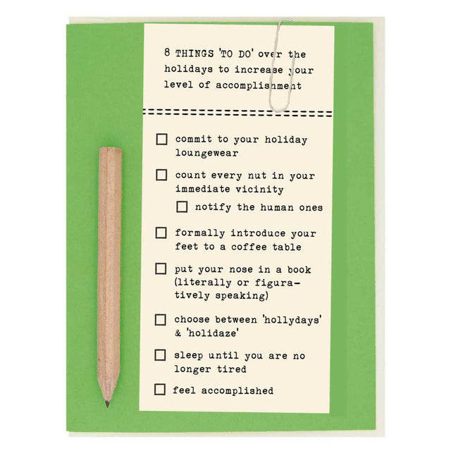 Feel accomplished over the holidays by completing these silly tasks. Comes with a mini pencil, a cream coloured envelope and measures 4¼” x 5½”.