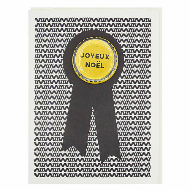 Joyeux Noel. Features a 1¼” button that can be taken off and worn by the recipient. Card measures 4¼” x 5½”, comes with a cream envelope & is blank inside.